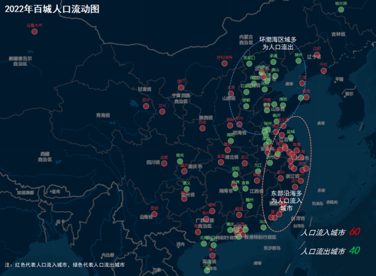 多年以来,人口的迁徙引起了城市的兴衰和时代的更迭,促进着城市化发展的进程。而进入后疫情时代,人口的迁徙又带来一些新的特征。根据诸葛找房数据研究中心监测的100个重点城市来看,2021年人口净流入的城市有60城,人口净流出的城市有40城,从区域分布来看,东部沿海地区仍然是我国人口的主要聚集地,大量人口依然选择进入长三角、珠三角经济圈,与此同时,中西部省会城市逐渐异军突起,成为重要的人口涌入地。环渤海区域人口面临大量流失,逃离环渤海成为大多数人的选择。