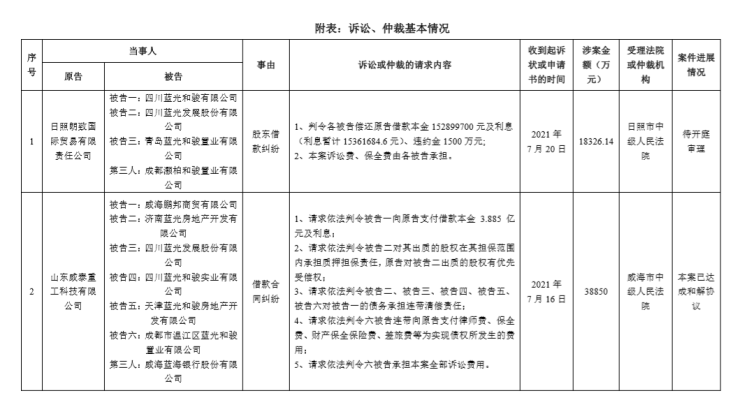 焦点财经讯 徐准7月30日,蓝光发展发布关于涉及诉讼和仲裁的公告。