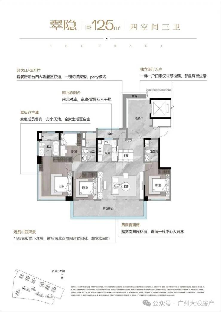 建面约125㎡,更是四房带双主套的板楼户型,拥有比肩豪宅的居住品质。