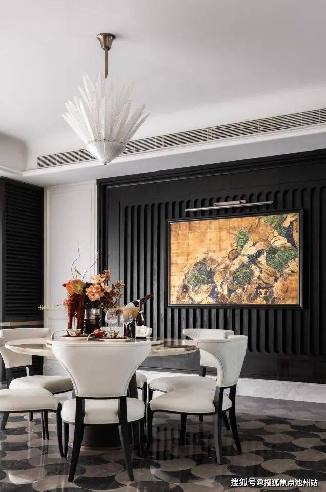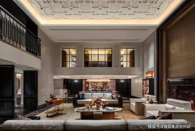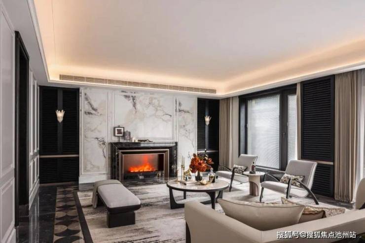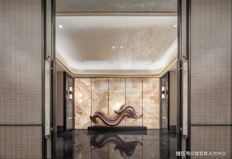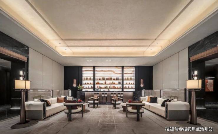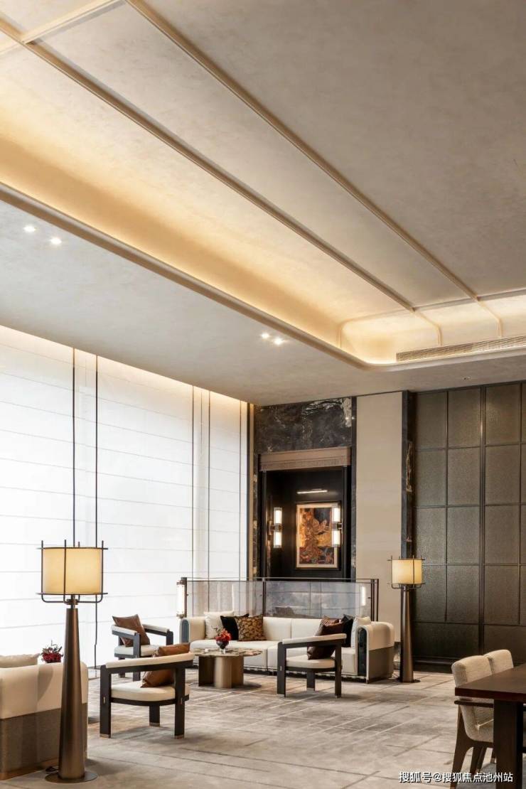 家具风格:现代东方美学线条,多人位沙发采用普拉达绿奢石的扶手+米色皮革拼接,茶几台面选用林海雪原天然奢石结合精致金属底座,形似吴越漆器方盒。