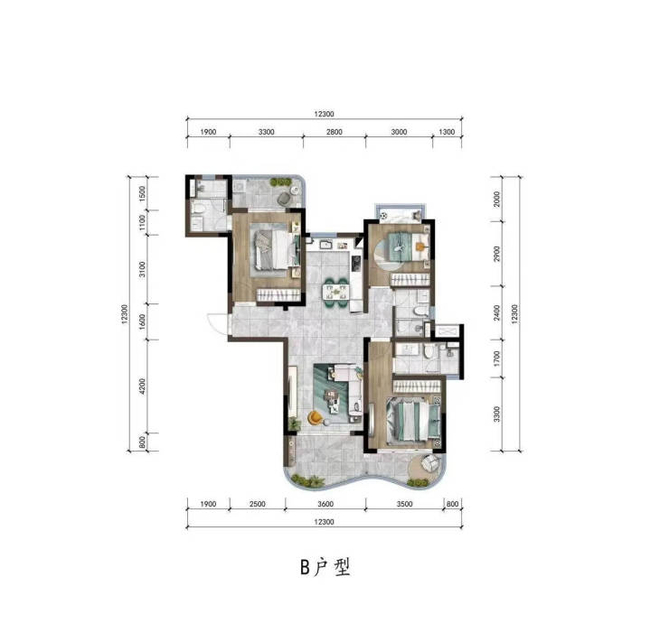 ▼“B”户型图约118㎡三室两厅三卫▼