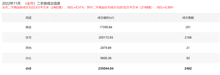 11月,深圳全市二手商品房成交为23.5万平方米(2482套),同比增加0.31%;其中二手商品住宅成交为20.52万平方米(2168套),同比上涨0.36%。