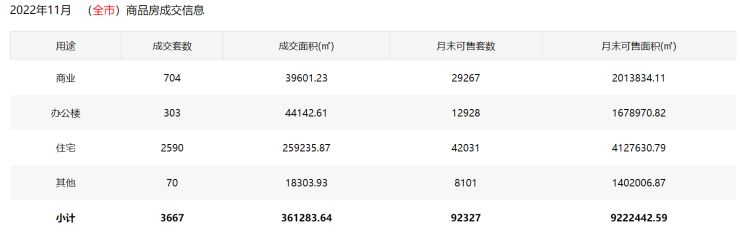 焦点财经讯 耿宸斐 12月1日,据深圳市房地产信息平台数据,2022年11月,深圳全市新建商品房成交为36.13万平方米(3667套),同比减少45.79%;其中新建商品住宅成交为25.92万平方米(2590套),同比减少53.39%。
