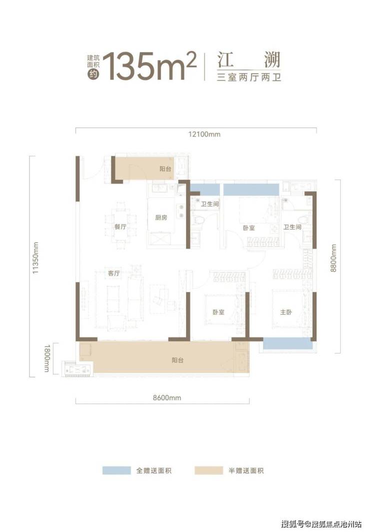 高比例阳台赠送,客厅、主卧、次卧、阳台全飘窗赠送,再加上一东一西两个超大阳台面积半赠送,超高比例赠送,全屋空间使用率达95%。
