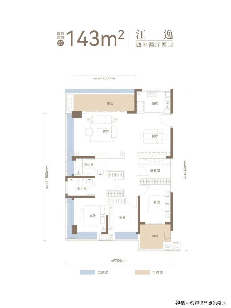建面约143㎡户型,270°采光U型观江+高比例阳台赠送+“3+1”格局动静分区+约30㎡主卧套房。