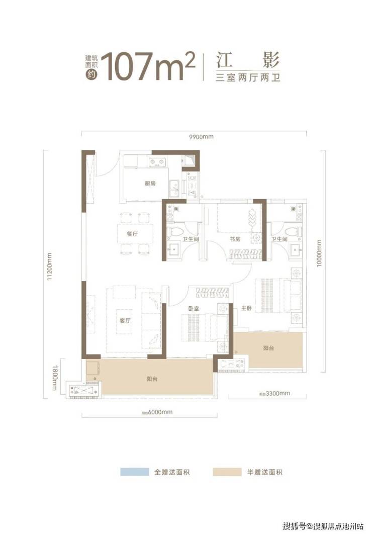 建面约107㎡户型,约10米南向观景阳台+约20㎡主卧套房+全明双卫。