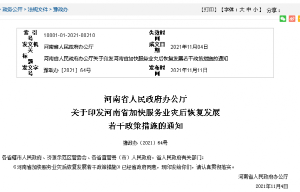 近日,河南省人民政府办公厅发布《河南省人民政府办公厅关于印发河南省加快服务业灾后恢复发展若干政策措施的通知》,通知内容如下:
