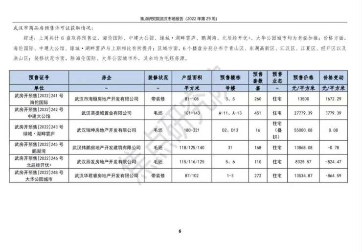 市场方面,上周共计6盘取得预售证,海伦国际、中建大公馆、绿城·湖畔雲庐、鹏湖湾、北辰经开优+、大华公园城市均为老盘加推;价格方面,海伦国际、中建大公馆、绿城·湖畔雲庐与上期相比有所提升;区域方面,6个楼盘分别分布于青山区、东湖高新区、江汉区、江夏区、经开区以及洪山区;装修状况方面,除海伦国际、大华公园城市外,其余均为毛坯房源。