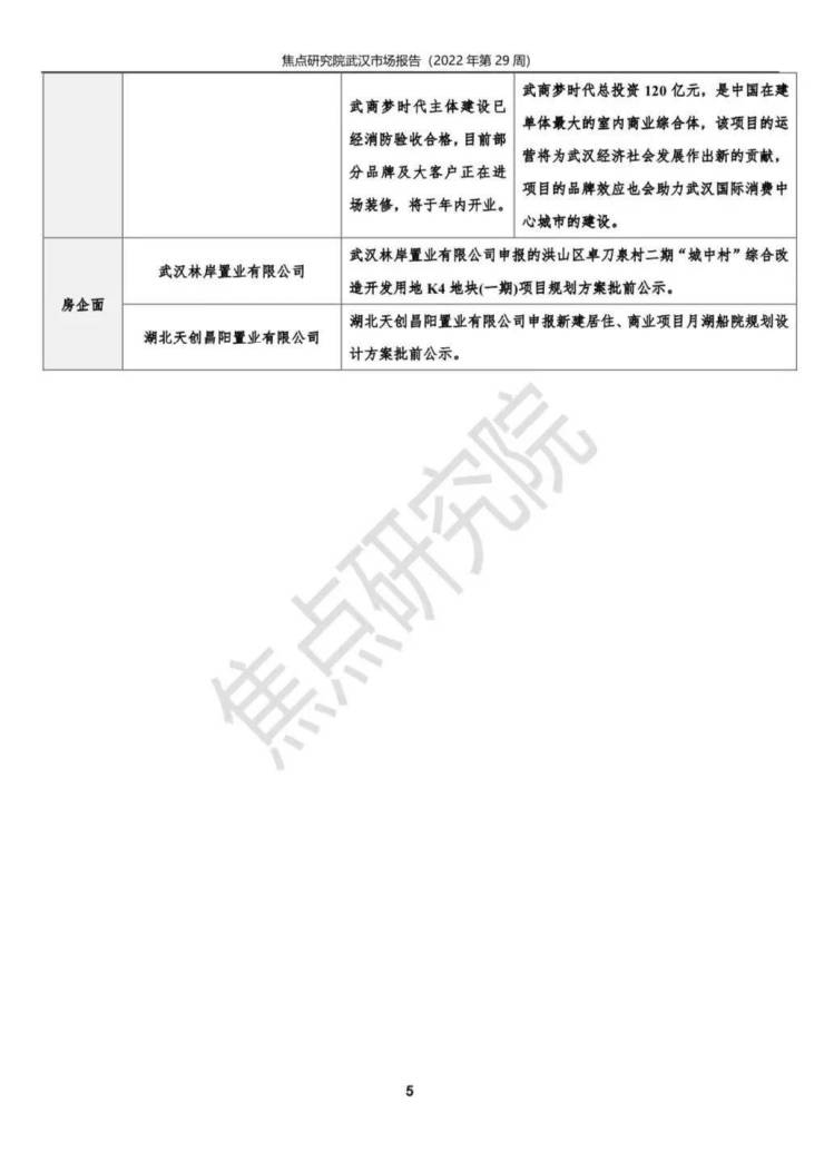 房企方面,武汉林岸置业有限公司申报的洪山区卓刀泉村二期“城中村”综合改造开发用地K4地块(一期)项目规划方案批前公示;湖北天创昌阳置业有限公司申报新建居住、商业项目月湖船院规划设计方案批前公示。
