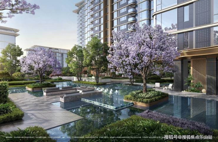 中庭水景占比约14%(总计约1400㎡),户户临水;甄选紫薇、蓝花楹等名贵树种,打造九重景观节点。