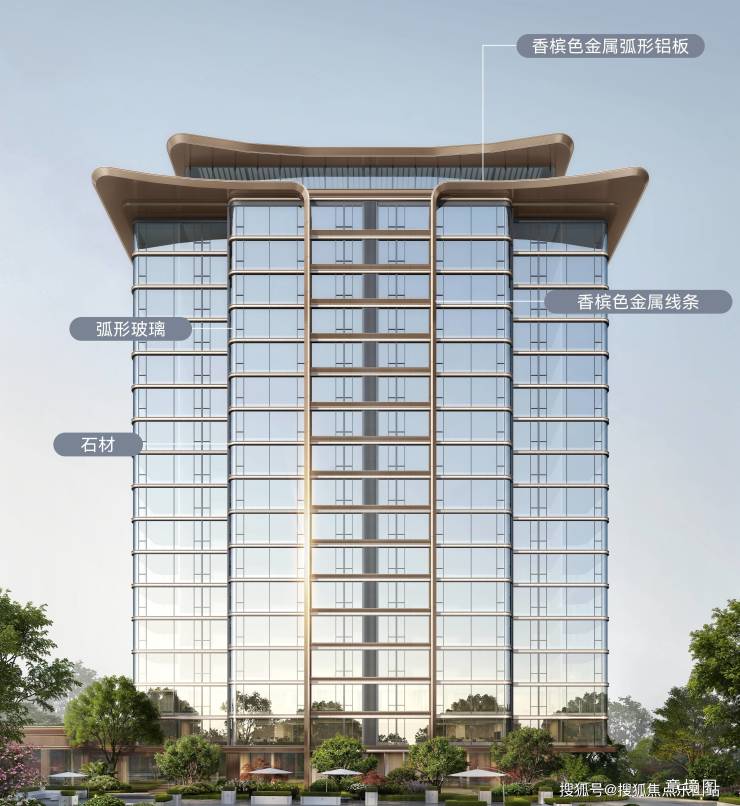 约66%超大窗墙比,采用玻璃幕墙+香槟金属线条+全球稀贵石材(翠谷幽兰、普拉达绿等15种),对标成都顶豪标准(如麓湖)。