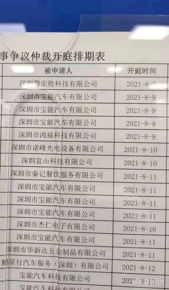 知乎上一位网友写道,从宝能离职后,他走上了仲裁之路,在仲裁庭看到8月案件排期,“宝能汽车”三天内有8宗案件等待开庭。