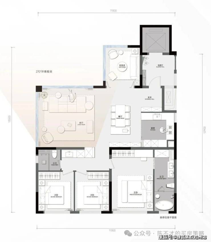 270°全景仓设计,超12米全景落地窗,客厅可以无遮挡看月湖。