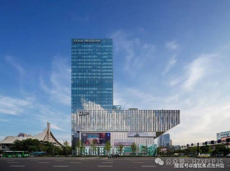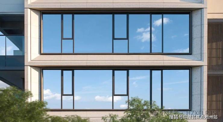 ▶鎏金高层:几何线条丨米黄色仿维纳多石材铝板丨香槟色金线丨深灰色金属格栅丨三玻两腔LOW-E玻璃