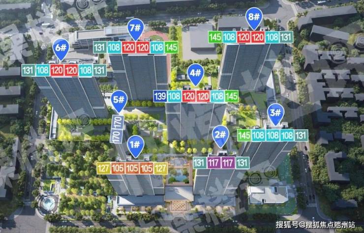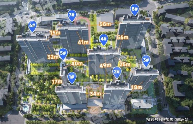 住宅部分整体由8栋22-39层的高层+超高层组成,其中5号楼为西南朝向,剩余楼栋为南北向。