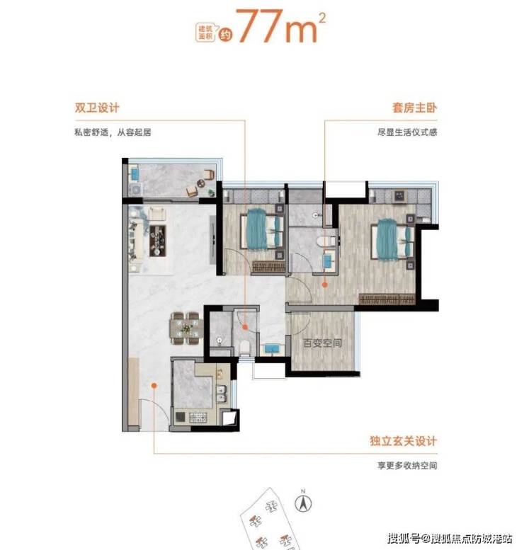 77㎡三房两卫:紧凑实用,超高实用率,适合刚需家庭,功能分区明确。