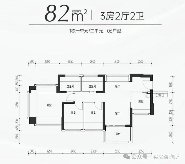 82㎡的3房2厅2卫,06户型,设计的是竖厅南北通透格局,进门独立玄关,LDKB一体化,主卧270°飘窗设计,U型厨房,卫生间干湿分离,得房率约98%(包含赠送),阳台主朝西北向。