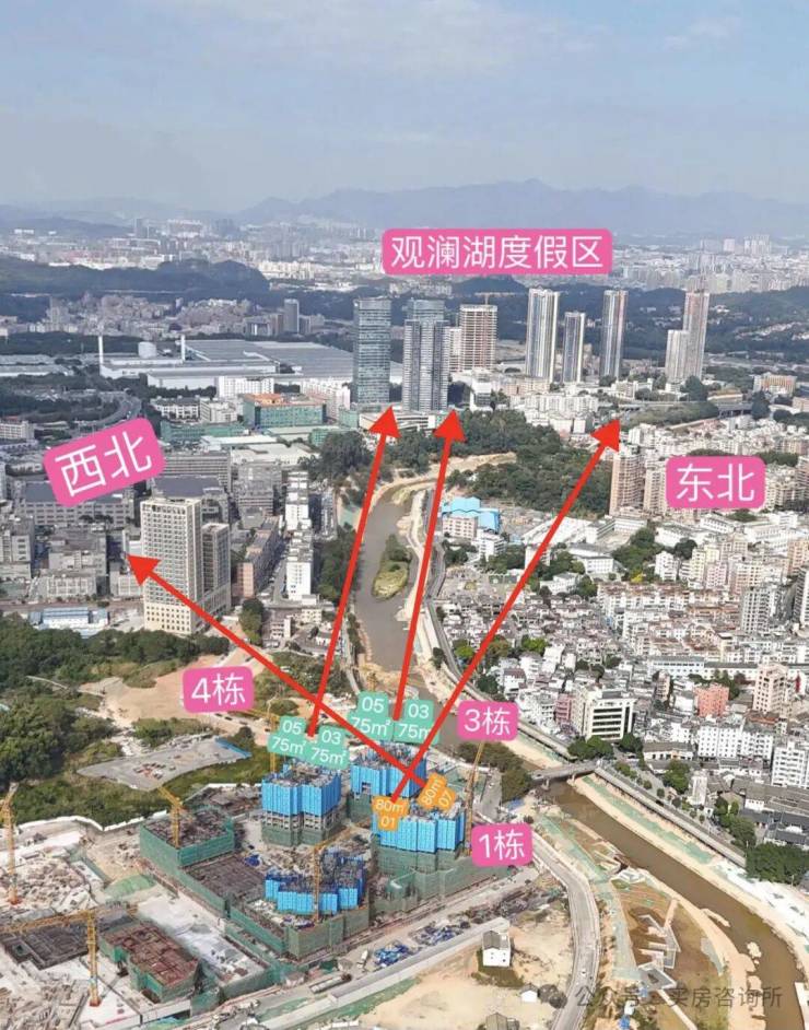△3-4栋东北朝向75㎡可以看观澜河,高楼层可以看远处的观澜湖度假区视野还不错,1栋01的80㎡也是可以看到,但是可能会被旁边得3栋遮挡一部分视野没有3-4栋好,但是户型比较不错南北通透