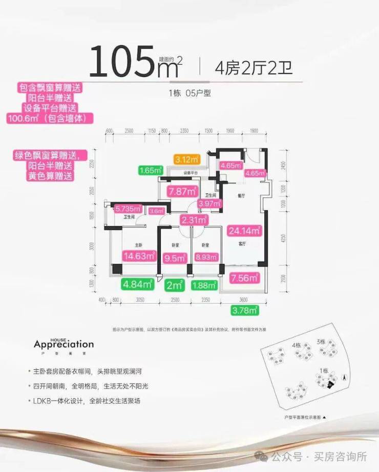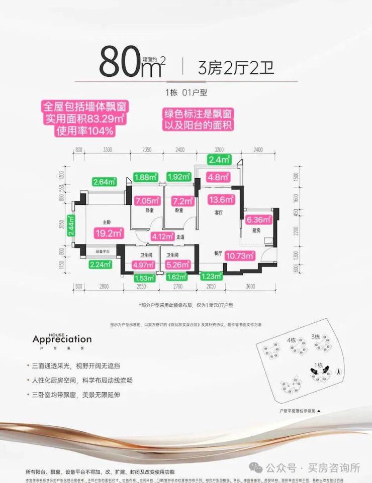 项目主推建面约72-105㎡的3-4房,根据户型测算,产品基本在98%使用率,最高实用率甚至能突破100%,相较于新规前普遍75%左右的得房率,堪称是“王炸”级别的存在!