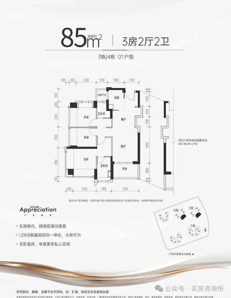 1栋105,3栋85都是东南朝向,视野最好可以看河景前面还没遮挡,西南朝向最好的是1号楼83的户型,可以看河景包括前面的城市景观没什么遮挡