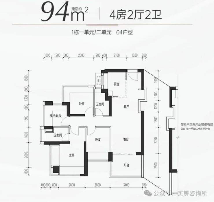 94㎡的4房2厅2卫,设计的是竖厅格局,进门独立玄关,LDKB一体化,S墙设计预留冰箱卡槽位,主卧双飘窗设计,U型厨房,卫生间干湿分离,得房率约97%(包含赠送),东南朝向。