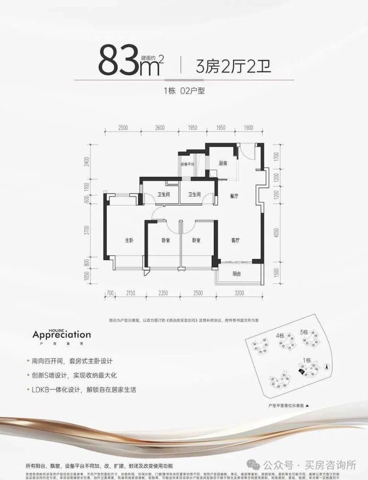 82㎡的3房2厅2卫,03户型,设计的是竖厅格局,进门独立玄关,LDKB一体化,S墙设计预留冰箱卡槽位,主卧双飘窗设计,L型厨房,卫生间干湿分离,得房率约100%(包含赠送),西南朝向。