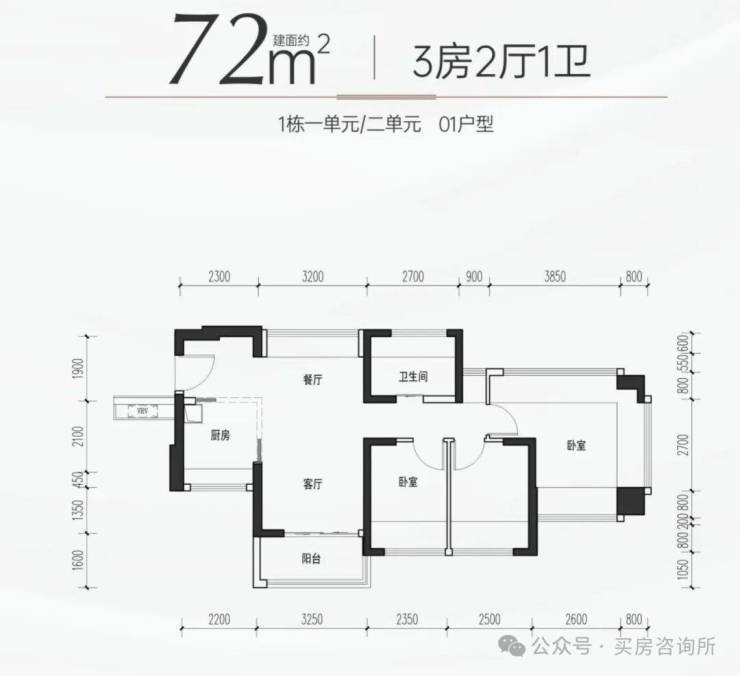72㎡的3房2厅1卫,设计的是竖厅南北通透格局,进门独立玄关,LDKB一体化,主卧270°飘窗设计,L型厨房,卫生间干湿分离,得房率约100%(包含赠送),阳台主朝东北向。