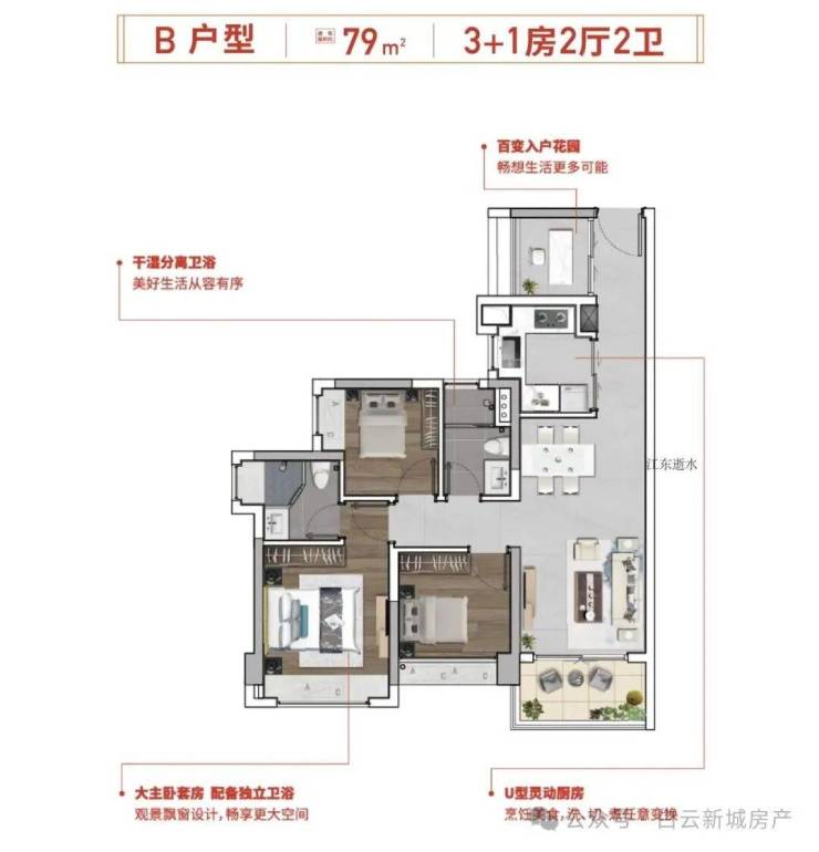 1.小区户型设计上使用率还是比较高,79㎡三房带主套,87㎡已经做到四房带主套了。