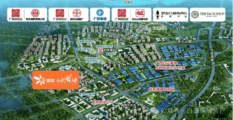 广州大健康产业基地:投资200亿,规模约等于22个广钢新城,已有何济公、明兴制、广药集团、和黄中药等29家知名健康产业企业入驻,健康城整体包含医药研制、职业教育、健康服务和健康养生四大功能片区。