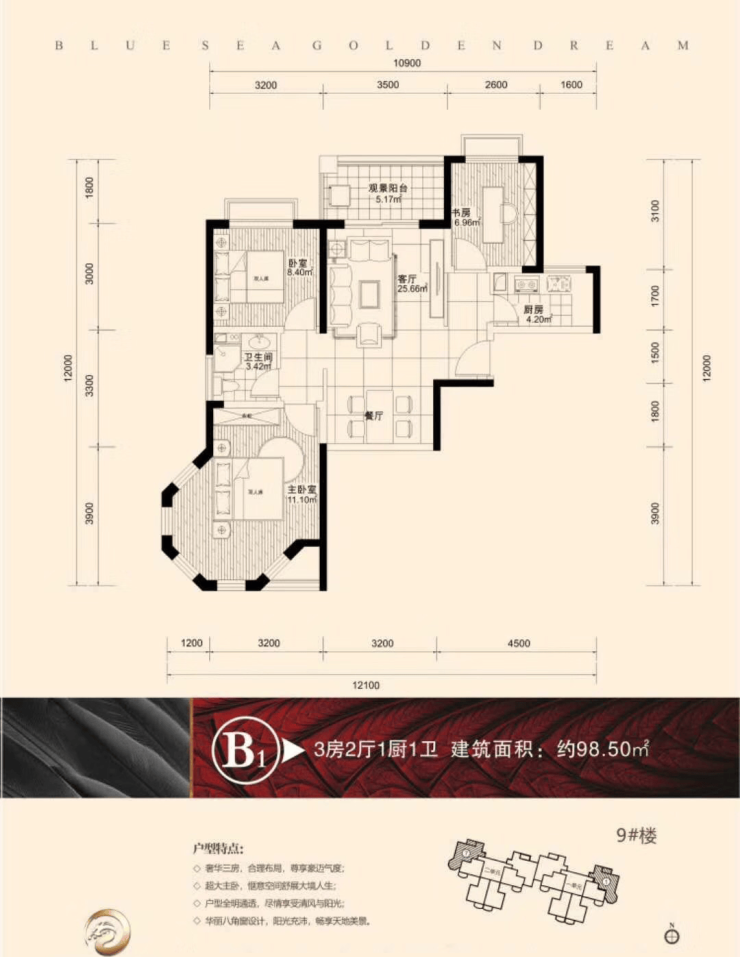 B1户型 建面约98.50㎡ 三房两厅一厨一卫