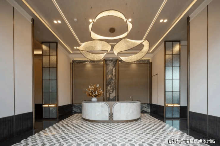 厅堂内大型水景艺术灯高悬于顶,以天为幕、气场大开,照映大理石地面,通体气派,传神东方宅邸的风骨。