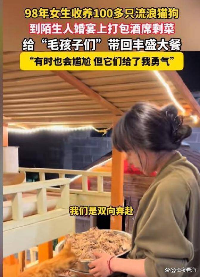 想到这个办法后,她就开始去婚宴打包剩菜了。宣宣本来有点害羞,但是为了猫咪们能吃饱,她就主动走到那些不认识的新人面前,然后说出自己的想法。通常呢,新人们都能理解她,也支持她。有的人甚至会很热情地请她坐下来一起吃。不过她都会很有礼貌地拒绝,但是她会在礼金簿上放个100块钱左右。她笑着说,这是“小猫小狗交的饭钱”。我觉得这个细节特别暖心,也体现了她对新人的尊重。
