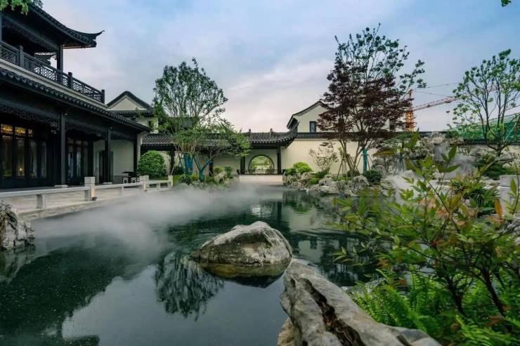项目以苏州园林为设计灵感,引水入园,通过枫、松、红梅等中式盆景造景,结合凯撒灰石材与传统门窗、影壁、屋顶等元素,营造古朴典雅的江南园林意境35。