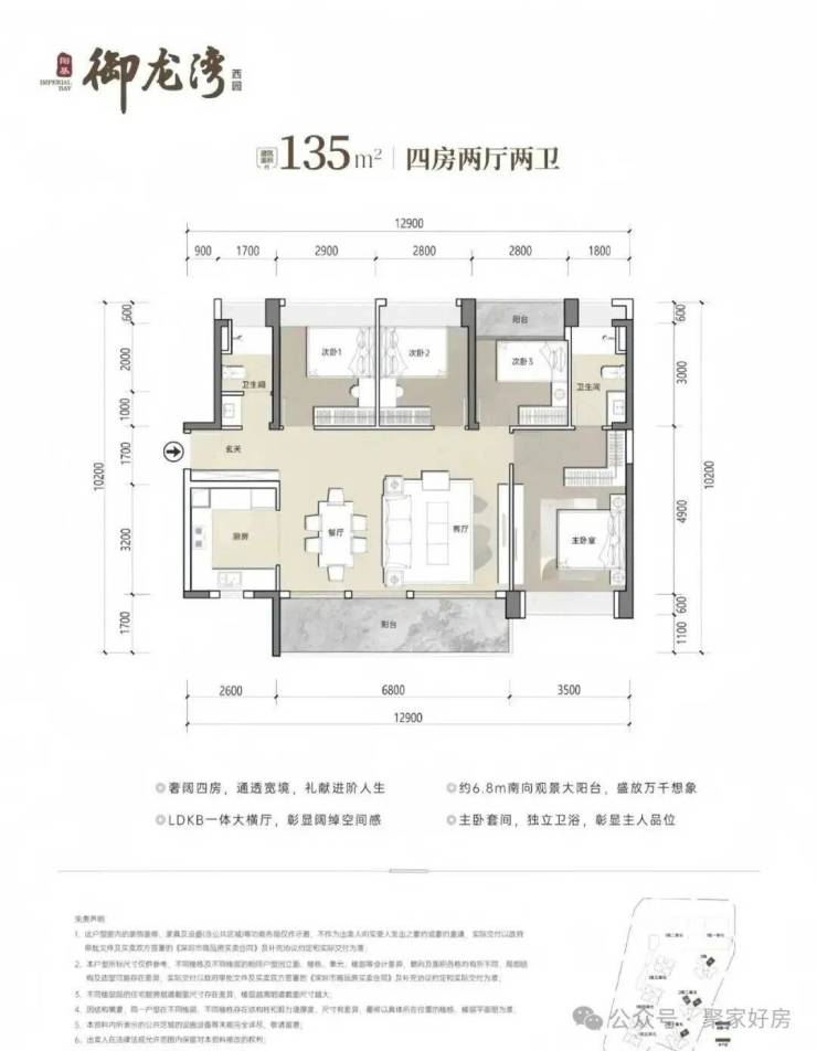 135㎡4房2卫,设计的是横厅南北通透格局,客餐厅开间6.8米,LDKB一体化设计,四开间朝南,U型厨房,公卫三段式分离设计,得房率约79.25%(不含赠送),阳台主朝东南或西南向,加上赠送得房率约90%