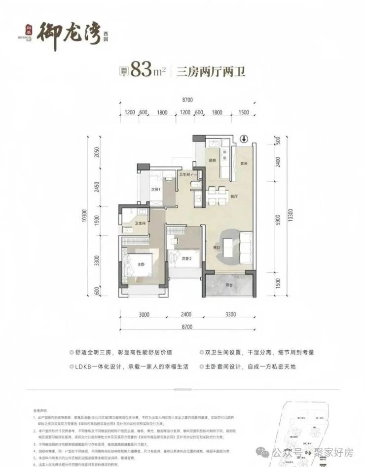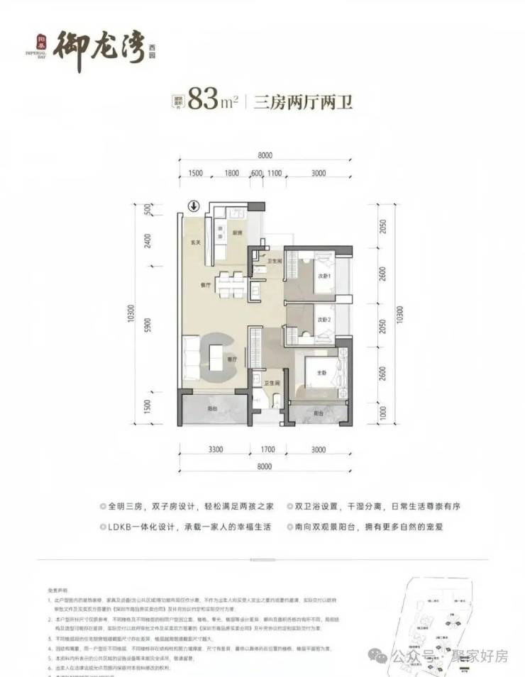 83㎡3房2卫,分布在2栋2单元03/04户型,设计的是竖厅格局,客厅开间3.3米,LDKB一体化设计,三开间朝南,U型厨房,公卫三段式分离设计,得房率约79.25%(不含赠送),东南或西南朝向,加上赠送得房率约89%