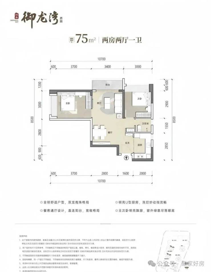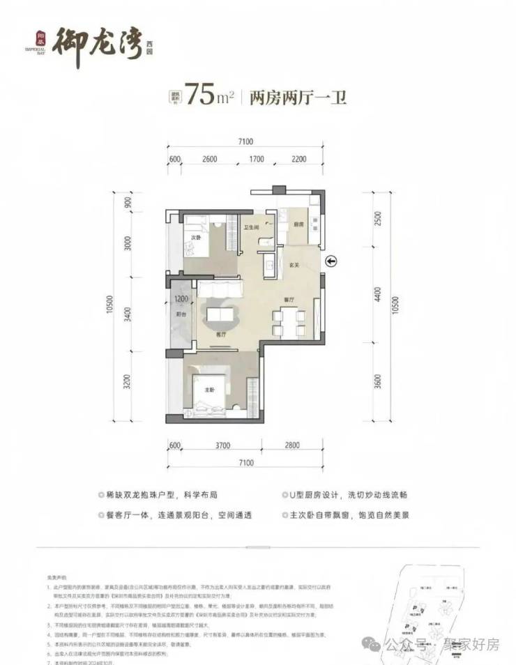 75㎡2房1卫,分布在1栋3/4单元03/06户型,设计的是竖厅稀缺的双龙抱珠格局,客厅开间3.4米,U型厨房,卫生间三段式分离设计,得房率约73.26%(不含赠送),东南或西北朝向,加上赠送得房率约80%