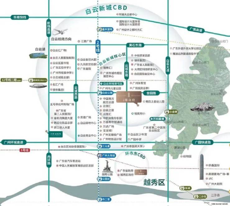 项目紧邻 广州市儿童公园、白云文化广场、广州体育馆、广州市城市规划展览中心、广东画院、白云国际会议中心等六大省市级地标建筑,南航三大总部、无限极总部、地铁设计院总院等总部大楼环绕在旁,共同构筑了一个高端、商务、国际化的生活圈层。