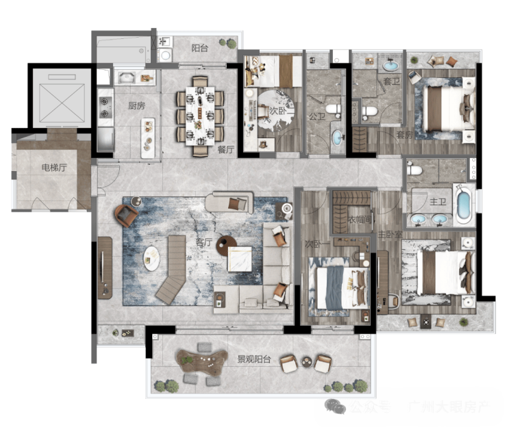 设计大师梁志天团队、汉森伯盛等知名团队打造,华为智能化系统配置,全屋 VRV 多联机空调等高品质交标。