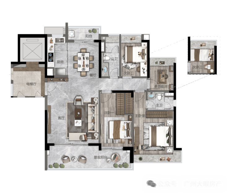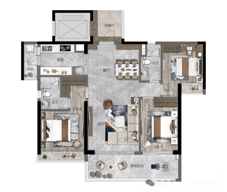 开创式大面宽、大开间、大阳台,2T3 户低密度舒适梯户比,专属私家电梯入户;