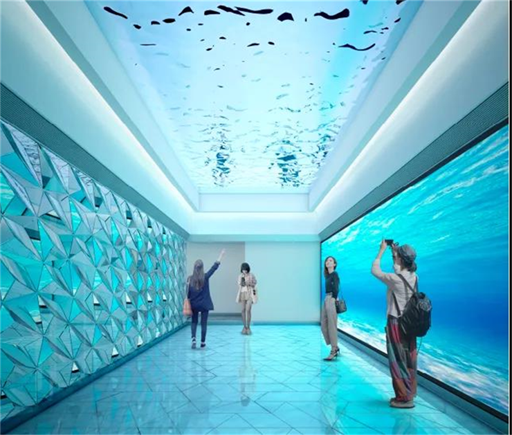 潮人打卡圣地“天井”,仿佛一处有趣的“水底世界”,蓝色波纹玻璃将阳光的光影投入眼帘,金色树木在斑驳的光影下熠熠生辉,待人邂逅钢筋水泥里的奇妙森林。