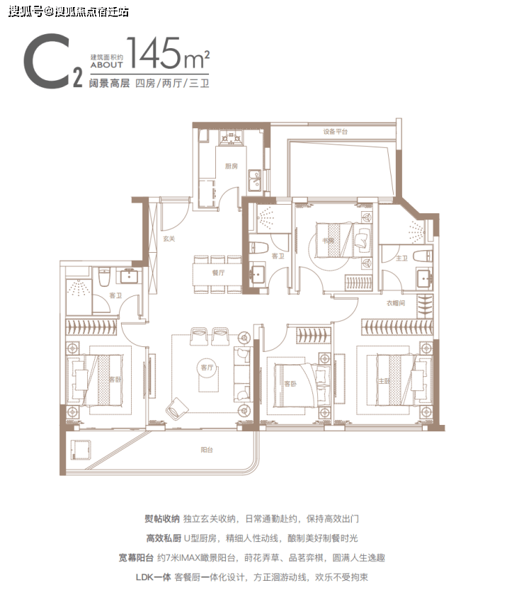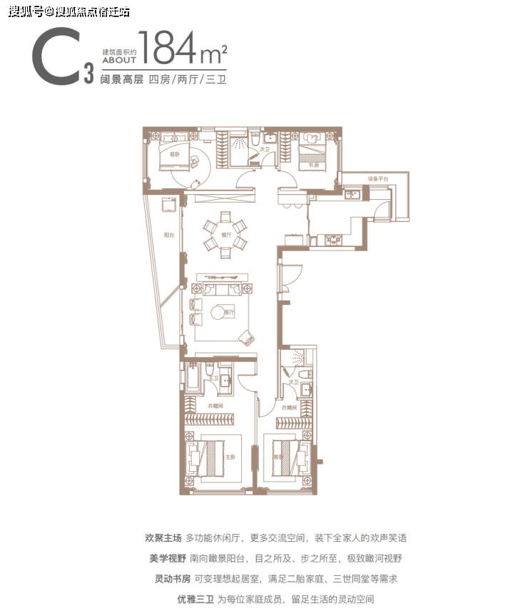 建面约140㎡四房:三开间朝南户型,南北通透,采光条件优质,客厅明亮宽敞,彰显大气布局。