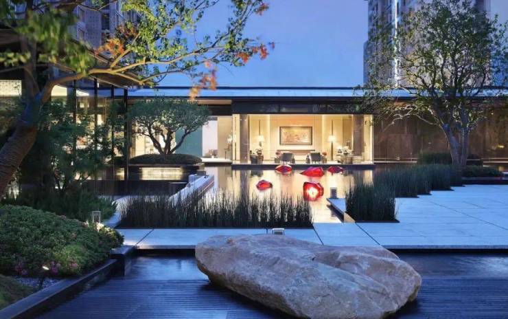 像申江三部曲的上海绿城外滩兰庭,在门庭主入口打造了具有“宝格丽”酒店气质的水景与酒店式落客区,铝板+玻璃幕墙+海派标志性圆弧倒角构建的绝美立面,刷新上海大平层的颜值天花板。