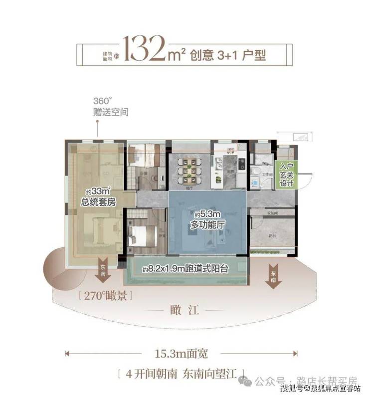 建面132平四房,8.2米跑道式阳台,全屋南北通透,约15.3米的南向采光面,东南向可望河景,5米4的大方厅,总价510-550万左右。
