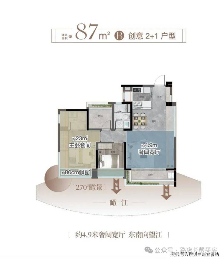 建面87平B户型,客厅开间4.9米,11.6米的南向采光面,宽景大阳台,主卧开间3.7米,面积约22平,配置了独立卫浴,还带L型大飘窗,总价330-360万左右。