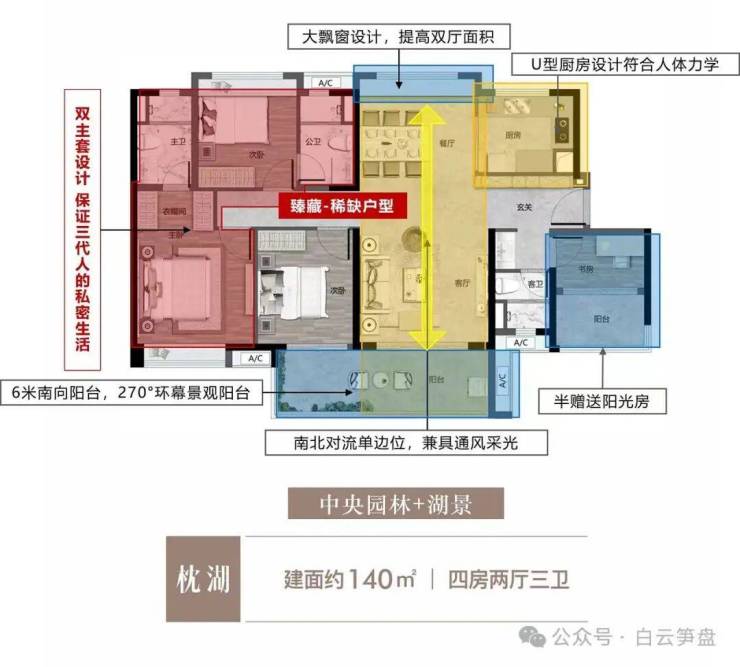 【140㎡四房二厅二卫】四房双主套,6米大阳台,望湖极致景观面!!