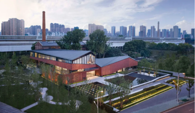 这座红色的建筑被命名为“拾光艺术馆”,主体由一个三级工业遗址氧气装站、一个二级工业遗址制氧车间改建而来。一眼望去,大量异形LOW-E玻璃与红色砖墙相互映衬,共同构建出独树一帜的风格幕墙。