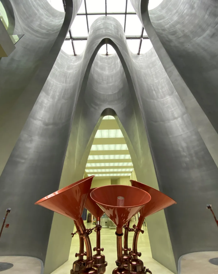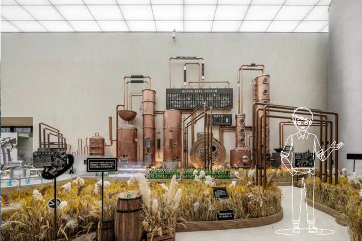 华润置地武汉啤酒博物馆整体构造以筒状与矩状相结合的方式,营造出奇异不规则的空间视野。博物馆大厅旁屹立着三个高耸筒仓,是雪花啤酒原厂的保留元素,在这里,历史感与现代感相互交融。