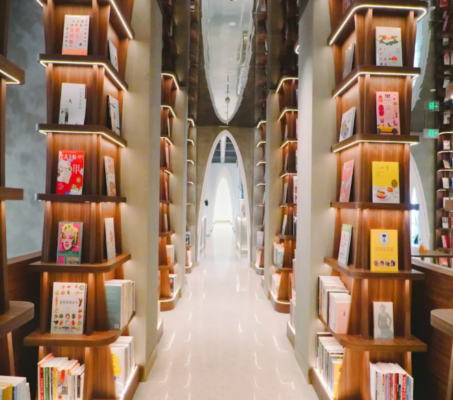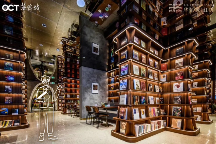 这是由被称为“最美图书馆”的钟书阁与华侨城“原岸书房”联合打造,分布在创意设计中心的一楼和三楼,从一楼通过“钢铁之魂”的红色旋转楼梯可直达三楼。一楼主要为成人阅读区,三楼则是亲子阅读区和儿童趣味阅读区,全区藏书近13000册,十分丰富。顶部运用镜面,营造视觉上的空间延伸感,将空间理念的运用发挥得酣畅淋漓。