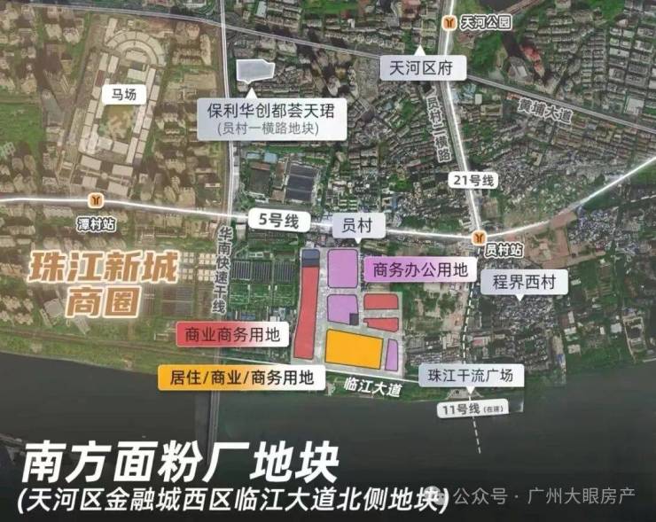 尤为值得一提的是,这是天河比较难得的靠近地铁站的盘,地块东北侧距离地铁5号线与11号线交汇的员村站仅150m,5号线+11号线可以连通广州最核心的几个商务圈---珠城、琶洲、天河北、白鹅潭等等,通达性很强。