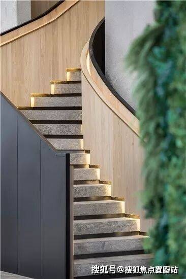 富有雕塑感的楼梯外观被漆成暗黑色,与原木色的相搭,更显的灵动却又不失优雅,阶梯间微微透出的黄色灯带,让人置于其中愈显温暖。也从细微之处看到设计师探索自然、融于艺术的初衷所在。除此之外,大面积绿植被置于空间当中,立足于长远的生态性原则且有氧低碳生活的理念引导。